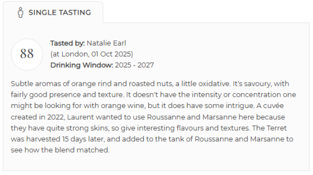 The Roussanne and Marsanne grapes were destemmed and blended in the same vat. Fermentation started with indigenous yeasts. Fermentation lasted two weeks. The Terret Gris, harvested later and in whole bunches, fermented separately for a month. The wine was blended, left to settle naturally in the cold and then bottled. No sulphur was added from the vine to the bottle.