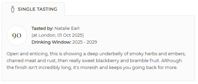 Robe rouge grenat brillante et limpide. Le nez est marqué par la présence de notes de garrigue, de poivre noir, de laurier ; suivent un mélange de fraise, de cassis et une finale sur la mûre. En bouche l'attaque est souple sur un très joli grain de tannin très caractéristique qui apporte une belle longueur. On retrouve les arômes méditerranéens de la menthe mais aussi de cuir et de poivre noir qui s’achèvent sur le cassis et la grenade. Ce millésime possède toujours cette forte personnalité et des notes sauvages qui gardent une surprenante et élégante harmonie.